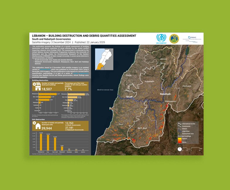 This publication from UN-Habitat Lebanon, the University of Balamand, and the Center for Environmental Research of the Eastern Mediterranean (CREEMO) at Saint Joseph University has released findings from a remote assessment of building destruction and debris quantities in areas affected by the recent conflict impacting Lebanon since October 2023. The assessment focuses on seven districts across the South and Nabatiyeh governorates, offering satellite imagery analysis of the scale of the conflict’s impact on aspects of the built environment. The publication is part of a series of similar assessments in different conflict-affected areas in Lebanon.
